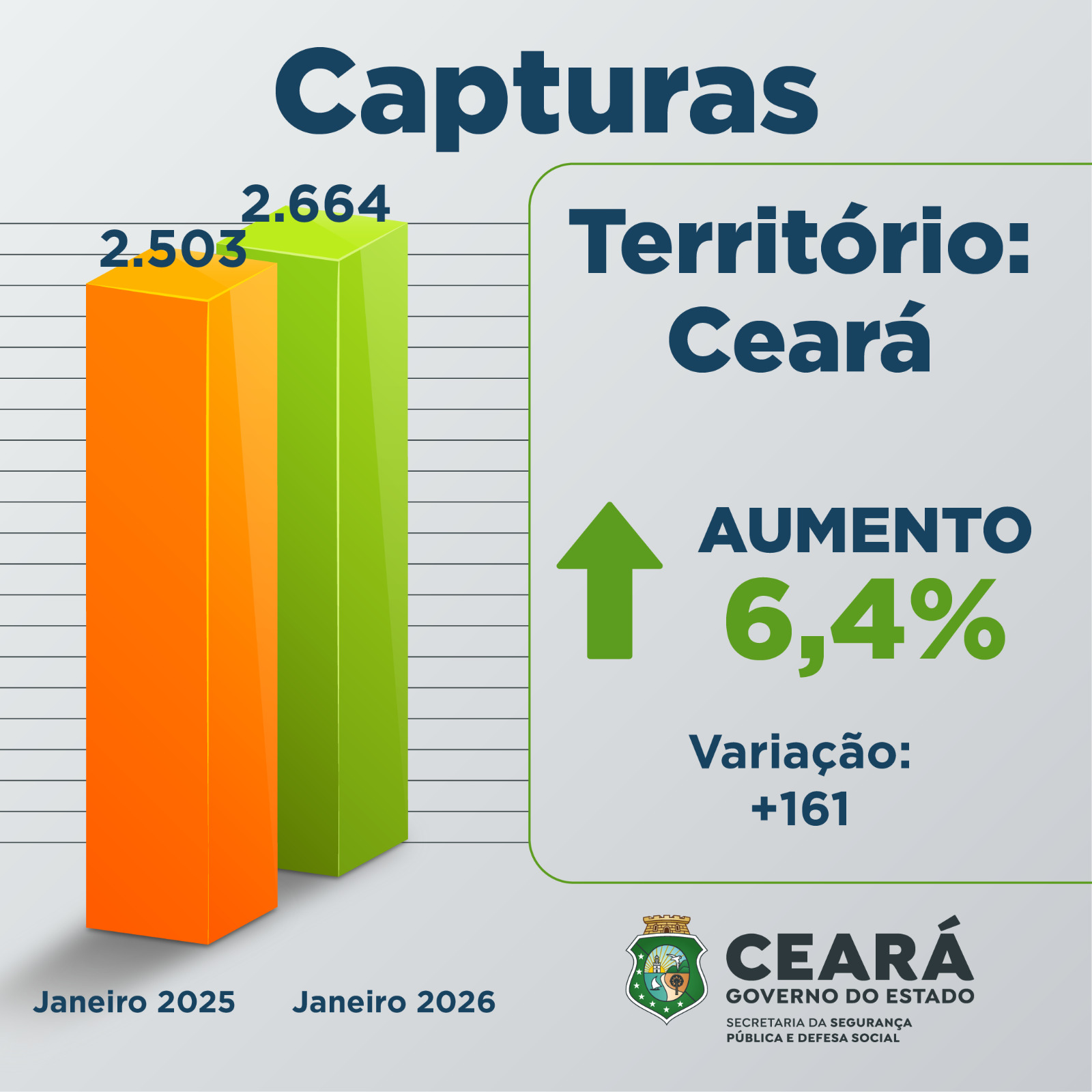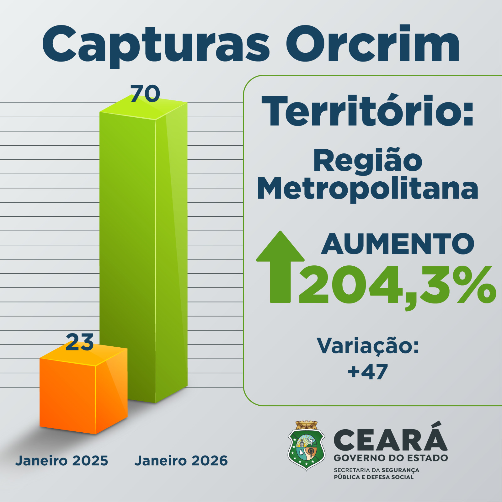 Os dados compilados pela Supesp apontam um aumento do número de prisões e apreensões por crimes diversos no Ceará, com um total de 2.664 capturas em janeiro de 2026. O maior aumento percentual de prisões e apreensões foi registrado na Região Metropolitana, que passou de 442 para 513, registrando uma variação de 16,1%. No Interior Sul, o aumento foi de 9,0%, com 426 no primeiro mês de 2026, contra 391 no mesmo período do ano anterior. Já no Interior Norte, o aumento foi de 6,5%, com 313 registros em janeiro de 2026, contra 394 ocorrências de prisões e apreensões em janeiro de 2025. Em Fortaleza, foram 1.005 capturas, contra 995 no mesmo período de 2025, um acréscimo de 1,0%.