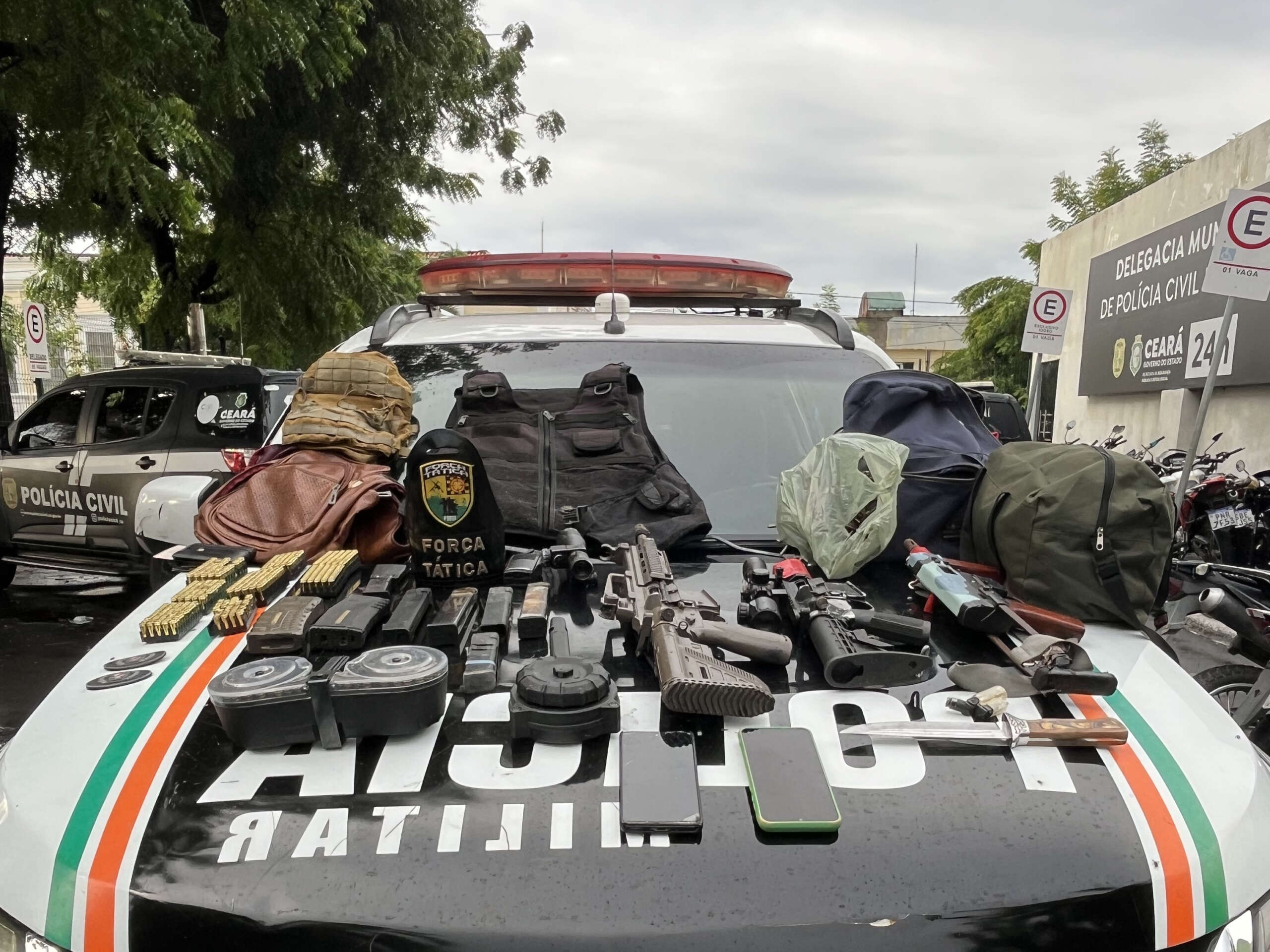 Como resultado do policiamento ostensivo realizado de forma diuturna e ininterrupta na Região Norte do Estado, a Polícia Militar do Ceará (PMCE) capturou oito suspeitos de envolvimento em crimes e apreendeu diversos materiais ilícitos com o grupo – incluindo armas de fogo, centenas de munições e objetos utilizados para a prática criminosa. A ofensiva policial ocorreu na madrugada desta segunda-feira (9), na cidade de Sobral, que pertence à Área Integrada de Segurança Pública 3 (AIS 3) do Ceará.