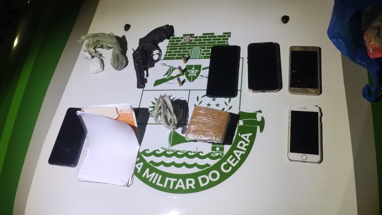 Equipes da PMCE foram acionadas para uma ocorrência de lesão corporal por disparo de arma de fogo e, durante as diligências, os policiais militares receberam informações que o suspeito estaria com drogas em um imóvel. Na residência indicada, as equipes apreenderam um homem, de 20 anos, em posse de um revólver calibre 32, munições do mesmo calibre, 222 gramas de maconha, 26 gramas de cocaína, 22 gramas de crack, um caderno com anotações e cinco aparelhos celulares. No imóvel, também foi localizado um adolescente, de 17 anos. O homem já possui antecedentes por tráfico de drogas e homicídio doloso. Já o adolescente, responde por atos infracionais análogos aos crimes de roubo, tráfico de drogas e periclitação da vida ou saúde.