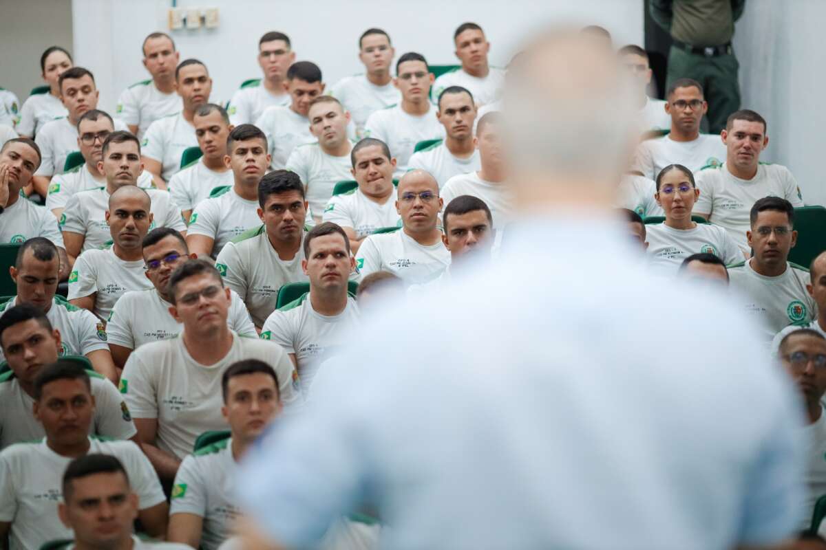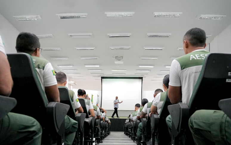 Com o objetivo de compartilhar experiências profissionais e incentivar os novos profissionais da segurança pública, o secretário da Secretária de Segurança Pública e Defesa Social do Ceará (SSPDS-CE), Roberto Sá, participou de uma conversa com os alunos do último ano do Curso de Formação de Oficiais (CFO) da Polícia Militar do Ceará (PMCE). O momento foi realizado na manhã desta terça-feira (24), no auditório da Academia Estadual de Segurança Pública (Aesp/CE), em Fortaleza. Além dos alunos, participaram o diretor-geral adjunto da Aesp, Ciro de Assis Lacerda; e o chefe de gabinete da SSPDS, coronel PMCE Cristiano Lins.