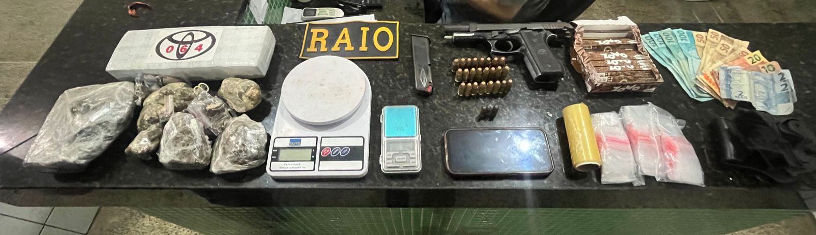 A ocorrência teve início, por volta das 18h, após os policiais militares do Comando de Policiamento de Rondas de Ações Intensivas e Ostensivas (CPRaio) receberem informações a respeito de uma ocorrência de tráfico de drogas na área. Durante a aproximação, um indivíduo correu para dentro de um imóvel e se evadiu pelo telhado. Um segundo suspeito, de 18 anos, foi capturado pela composição. No endereço, foram encontrados 1,9 kg de maconha, uma pistola .40, 27 munições .40 e 380, duas balanças de precisão e material para embalar entorpecentes.