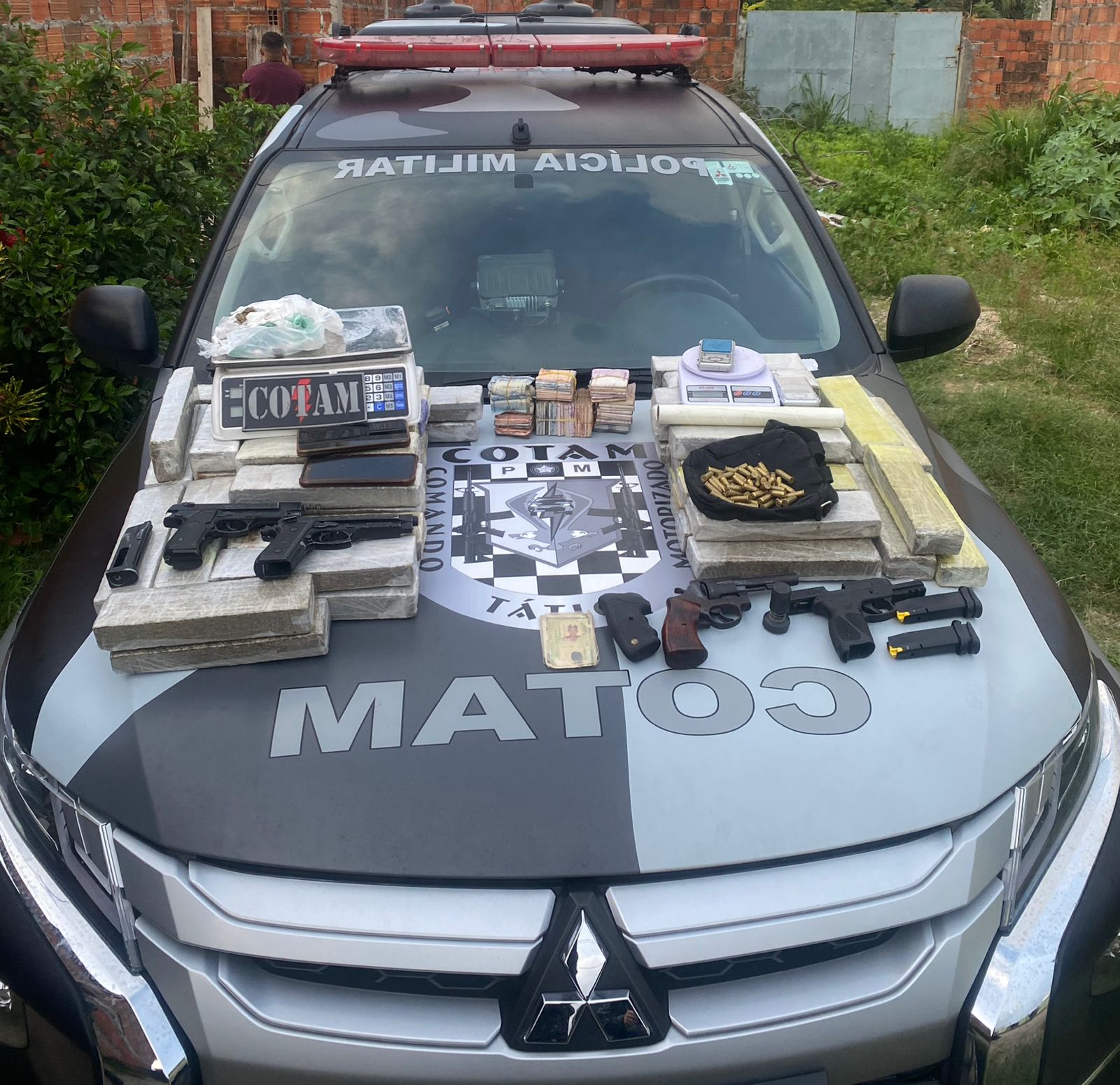 No imóvel, os policiais militares encontraram 36,7 kg de maconha, 90 g de cocaína e 3 g de crack, além de uma pistola e 28 munições 9 mm, um revólver e 26 munições .38, dois simulacros de pistola, quatro balanças de precisão, uma quantia em dinheiro e material para embalar entorpecentes.