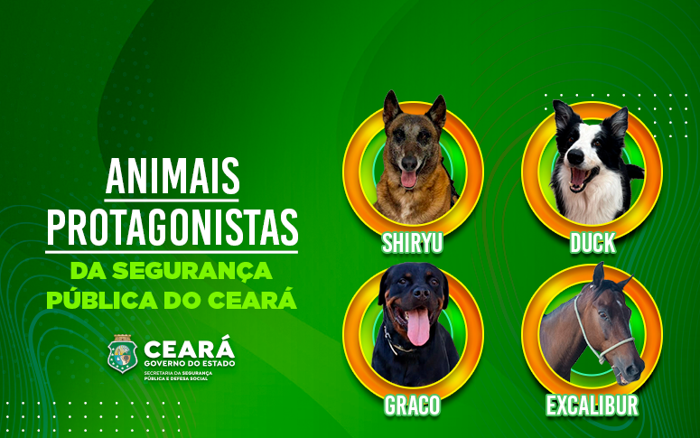Em homenagem à data, a Secretaria da Segurança Pública e Defesa Social do Estado do Ceará (SSPDS/CE) apresenta alguns dos animais que atuam ao lado das Forças de Segurança do Estado. São cães que integram equipes da Polícia Militar do Ceará (PMCE), do Corpo de Bombeiros Militar do Estado do Ceará (CBMCE) e da Polícia Civil do Estado do Ceará (PCCE).