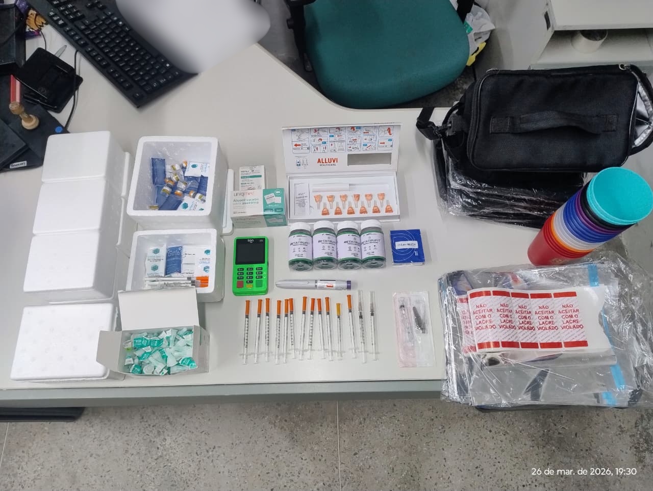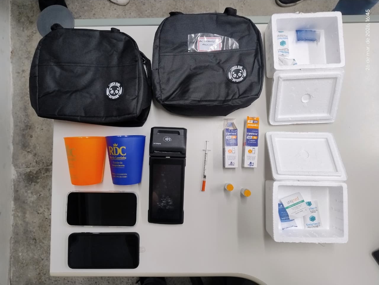 Em continuidade das diligências, uma equipe policial deslocou-se à residência do suspeito, no bairro Messejana (AIS 16), onde foram apreendidas mais bolsas térmicas, caixas de isopor, ampolas com medicamentos, seringas e outros diversos insumos de uso médico – comumente empregados na montagem de kits voltados ao tratamento de emagrecimento. Celulares e máquinas de cartão de crédito também foram confiscados na ação.