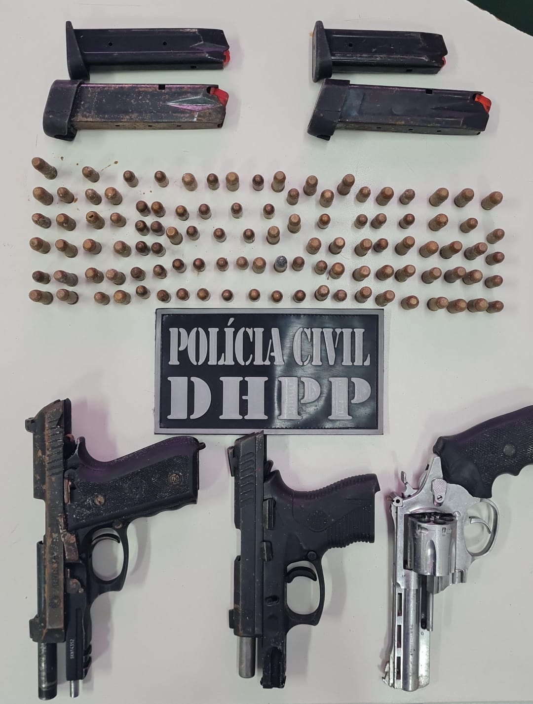 Ainda durante as diligências no endereço, as equipes realizaram a abordagem de outro homem que estava junto com o alvo da ação policial. Com o segundo suspeito, de 19 anos, os policiais apreenderam uma sacola plástica contendo uma pistola calibre .40 com um carregador adicional e munições de mesmo calibre, além de um revólver calibre 38. Com as buscas pela área, as equipes localizaram uma pistola calibre .380, totalizando três armas de fogo recolhidas no local.
