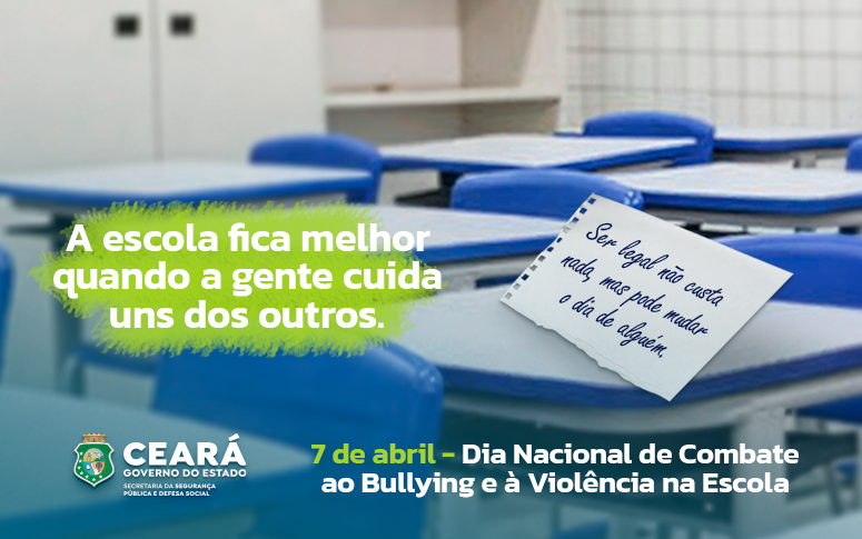 Em alusão ao Dia Nacional contra a Violência e o Bullying nas Escolas, nesta terça-feira (7), a Secretaria da Segurança Pública e Defesa Social (SSPDS) apresenta os serviços da Polícia Civil do Estado do Ceará (PCCE) e da Polícia Militar do Ceará (PMCE) para a prevenção contra o bullying no cotidiano escolar.
