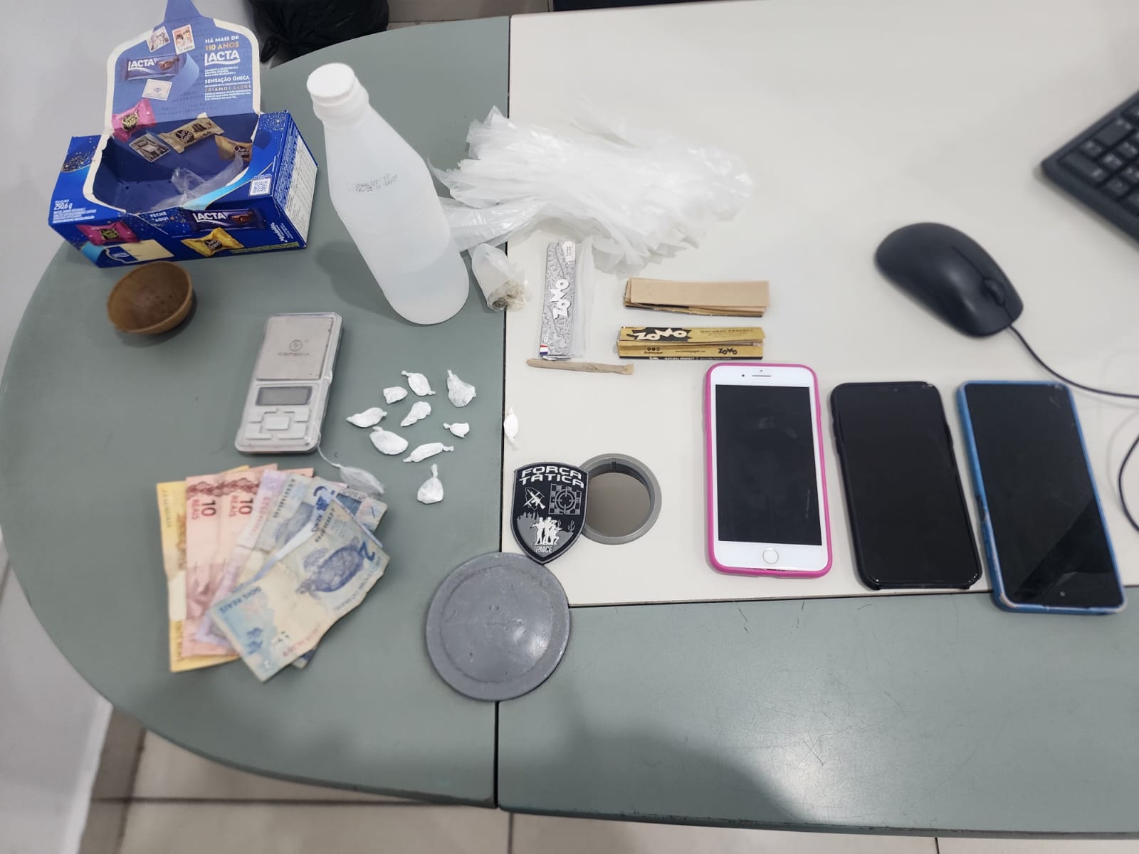 Durante um patrulhamento na madrugada desta sexta, uma composição do 18º Batalhão da Polícia Militar (18º BPM) localizaram duas mulheres, de 22 e 21 anos, entrando em uma residência em atitude suspeita. Durante a abordagem, os policiais localizaram com a mulher de 22 anos, dez trouxinhas de cocaína, uma garrafa de 250 ml de uma substância popularmente conhecida como “loló”, uma quantia em dinheiro, uma balança digital, uma tesoura, 45 sacos plásticos e três envelopes de papel de seda. Já com a mulher, de 21 anos, foi encontrado um aparelho celular com queixa de roubo/furto.