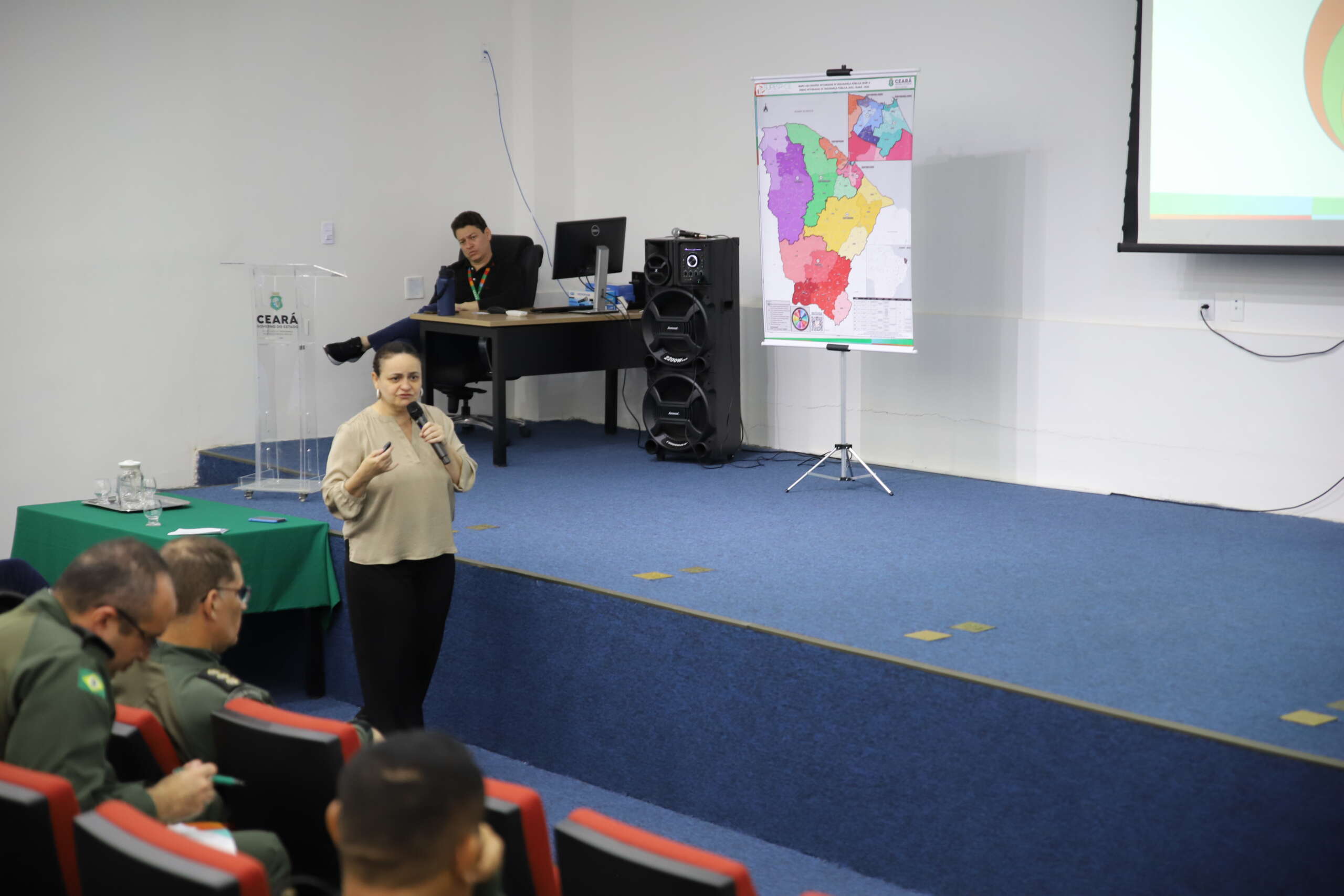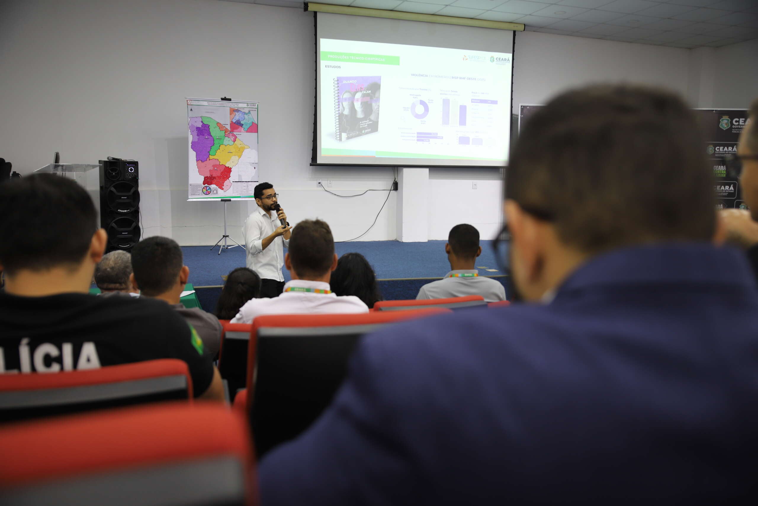 No segundo encontro da Caravana da Superintendência de Pesquisa e Estratégia de Segurança Pública (Supesp), profissionais da segurança pública assistiram a uma apresentação sobre a missão da superintendência, suas atribuições e como o órgão atua junto às vinculadas da Secretaria da Segurança Pública e Defesa Social (SSPDS/CE).