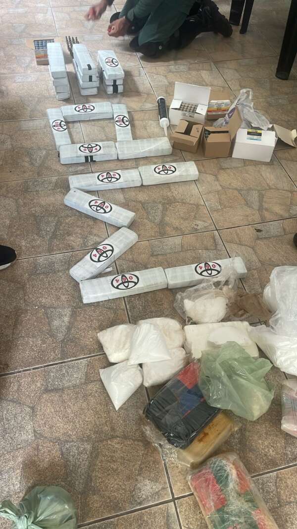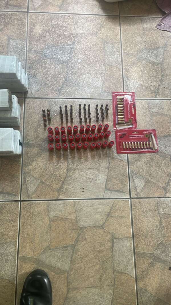 O suspeito foi abordado no portão da residência, onde foi visualizado, na área de garagem, um tablete de maconha. Em vistorias no local, os policiais militares encontraram outros tabletes da droga na garagem, em um dos quartos e no interior de um armário, totalizando 19,8 kg. Também foram encontrados 12,5 kg de cocaína, 6,1 kg de skunk e 544 g de haxixe em uma geladeira e no quarto. Outros materiais para a fabricação e comercialização de drogas também foram apreendidas. Além dos entorpecentes, uma espingarda calibre 12 e 92 munições de diferentes calibres foram apreendidas.