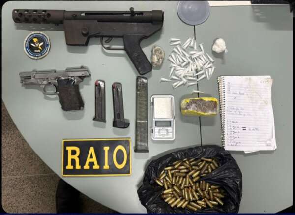 No endereço, foram localizadas uma arma de fabricação artesanal calibre 9mm, uma pistola calibre 380, 44 munições de 9mm, 15 munições de calibre 38, 30 munições de calibre 380 e quatro estojos deflagrados de calibre 38. Em continuidade, durante buscas no interior da residência, os militares apreenderam entorpecentes e uma balança de precisão. O suspeito já possui passagens na polícia por porte ilegal de arma de fogo e posse ilegal de arma de fogo de uso restrito.