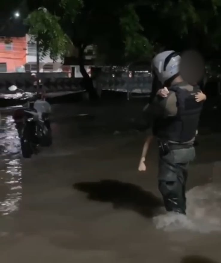 Um policial militar do 5º Batalhão da Polícia Militar do Ceará (PMCE), resgatou uma família que corria o risco de ser arrastada por uma enchente no bairro Conjunto Ceará, Área Integrada de Segurança Pública 17 (AIS 17) de Fortaleza, na madrugada deste domingo (19), durante as fortes chuvas que aconteceram na Capital.
