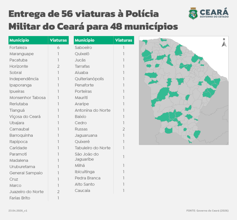 Desde 2023, o Governo do Ceará já entregou 1.422 viaturas às forças de segurança. Do total, 966 foram destinadas à Polícia Militar (das quais 136 blindadas); 213 à Polícia Civil (sendo 28 com blindagem); 79 ao Corpo de Bombeiros Militar; 20 à Perícia Forense; 73 à Secretaria da Segurança Pública e Defesa Social; e 70 à Secretaria da Administração Penitenciária e Ressocialização.