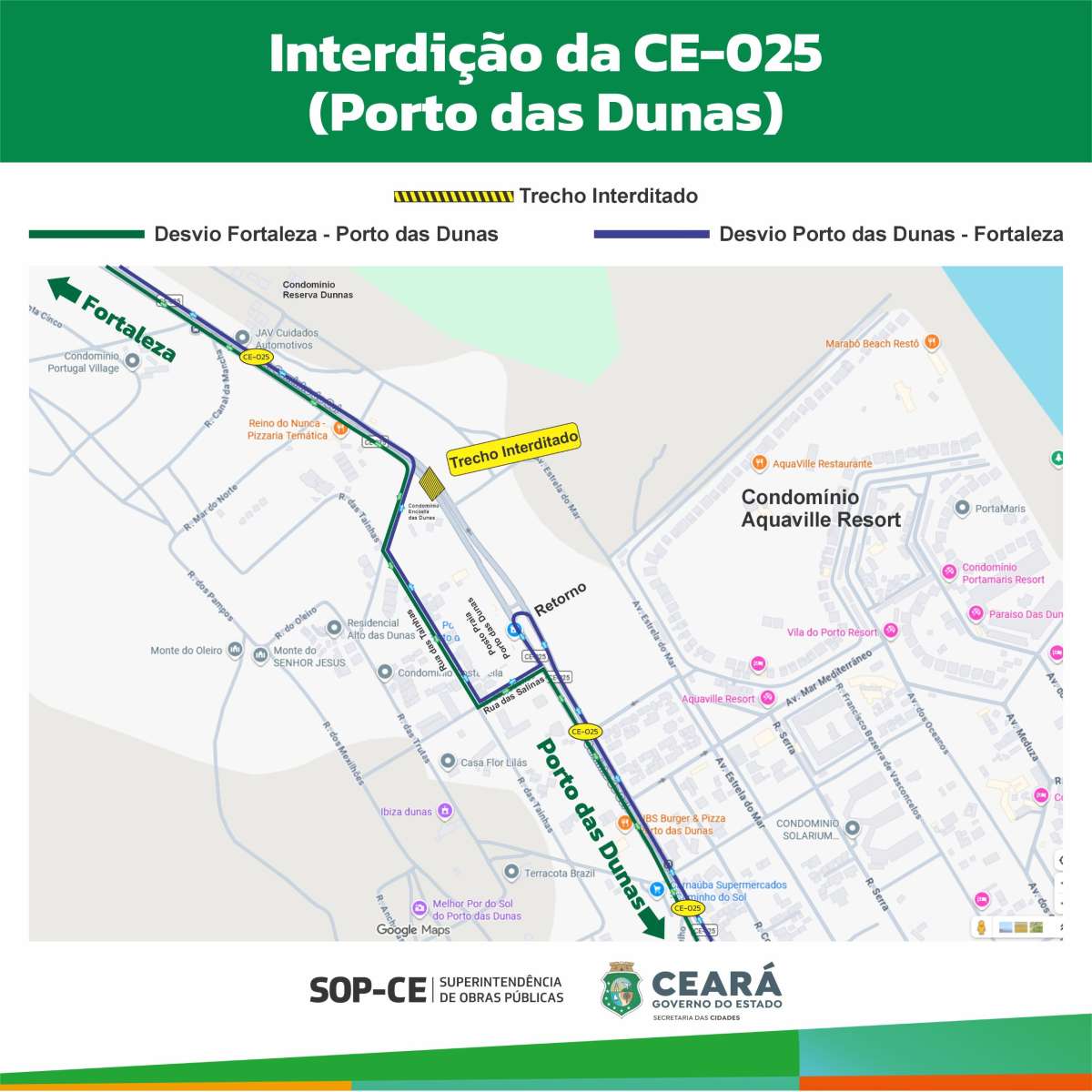 Com o bloqueio e isolamento do trecho, visando a segurança dos usuários, os condutores devem utilizar as CE-010 e CE-040 como rotas alternativas. Quatro viaturas e um guincho do Batalhão de Polícia de Trânsito Urbano e Rodoviário Estadual (BPRE) atuam no controle do tráfego. Agentes do BPRE orientam o desvio da Avenida Litorânea (CE-025), nas proximidades do Alphaville. Eles também estão posicionados na Avenida Caminho do Sol (CE-025), na rotatória do Beach Park, orientando motoristas e garantindo a fluidez do trânsito. Técnicos da SOP, BPRE e Demutran de Aquiraz também definiram uma rota alternativa, por vias municipais, conforme mapa abaixo.