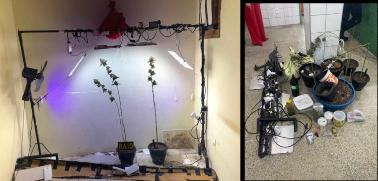 Durante as buscas, foi localizada uma estrutura tipo estufa destinada ao cultivo de maconha, além de dois pés da planta e uma quantia da droga já pronta para o consumo, além de materiais utilizados na produção.